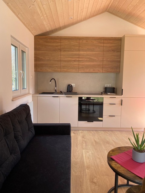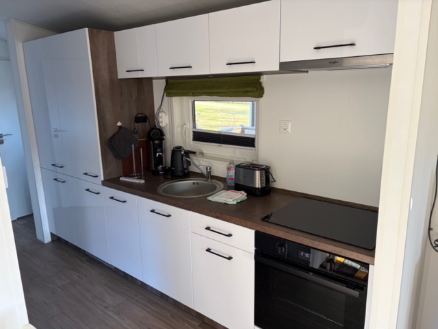 Die Küche in unserem Tiny House ist mit zwei Kochplatten und einem prima funktionierenden Backofen ausgestattet. Lebensmittel bleiben frisch im Kühlschrank mit Gefrierfach. Vorräte können in den Küchenschränken aufbewahrt werden.