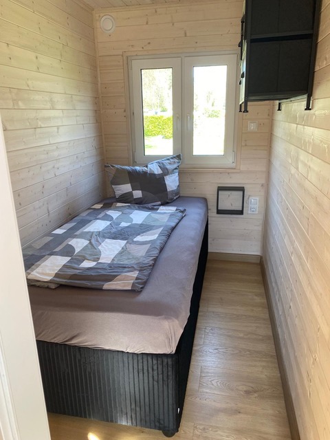 Zwei Personen finden im 1,60 m breiten Doppelbett im Schlafloft ihre nächtliche Ruhe. Unten im Wohnbereich gibt es eine ausklappbare Couch. Dort können zwei weitere Menschen schlafen, die sich allerdings gut vertragen müssen – mit den 1,40 m kann man sich nach dem Einschlafen schon mal zufällig begegnen.